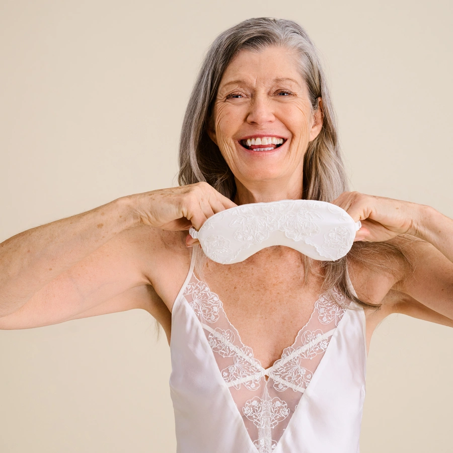 Unsere Jubiläumsedition – The 1955 Collection: Erholsame Nächte garantiert die edle Schlafmaske aus hochwertigem weissem Viskose-Satin, die vollständig mit romantischer Stickerei verziert ist. Da stört kein Licht die schönen Träume.