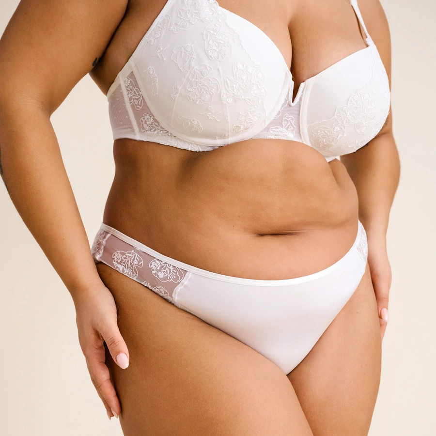Unsere Jubiläumsedition – The 1955 Collection: Dieser zauberhafte BH in Weiss ist die perfekte Ergänzung zur Brautmode oder ein romantischer Begleiter für die Flitterwochen. Mit seiner Transparenz macht er Lust auf die warmen Tage. Der Bügel-BH mit Schalen setzt das Dekolleté herzförmig ins Licht. Edle Hingucker sind das hübsche V-Detail und die hochwertigen roségoldenen Accessoires.