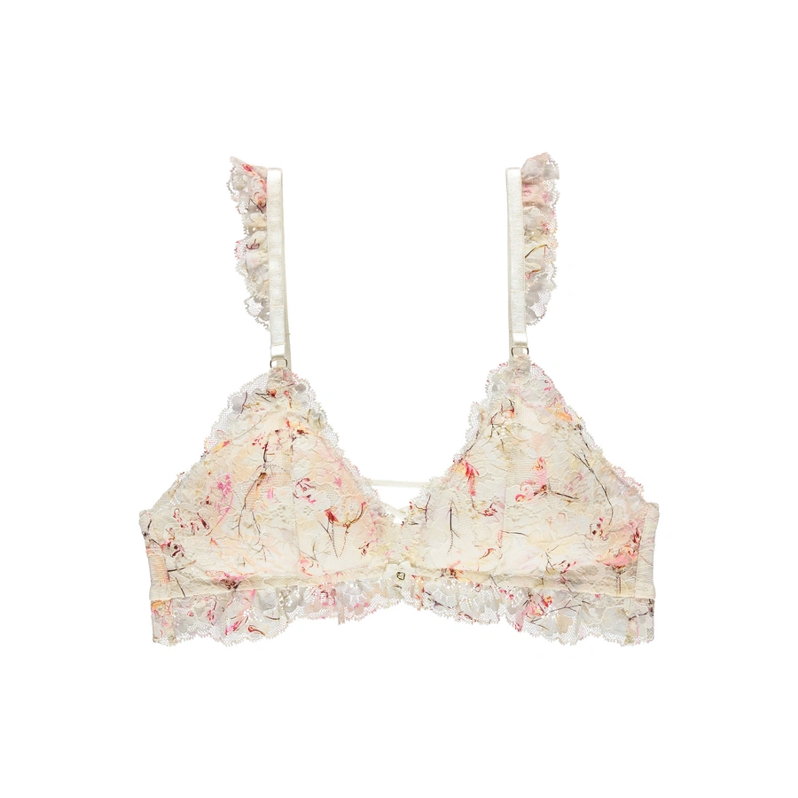 Sanfte Verführung: Der edle, cremeweisse Triangel-BH besteht vollständig aus feinster, bedruckter Spitze. Einen romantischen Akzent setzt das süsse Herz-Accossoire. Der BH hat keine Bügel und herausnehmbare Pads.