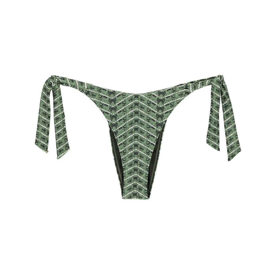 Ein wunderschönes Smaragdgrün mit geometrischem Batikprint sowie das samtweiche Material zeichnen den bequemen Bikinislip im Brazilian-Schnitt aus. Er schmiegt sich sanft an die Haut an und wird an den Seiten geschnürt.