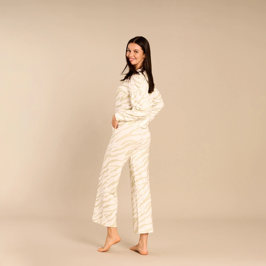 Der traumhafte Pullover «Pola» in sanftem Offwhite mit lindgrünem Animal-Print macht Lust auf Frühling. Mit seinem Rundhalsausschnitt, den überschnittenen Schultern mit Puffärmeln und den praktischen Bündchen ist er stylisch und bequem. Er lässt sich hervorragend mit anderen Naturtönen kombinieren. Der Pullover besteht aus einem hochwertigen, elastischen Jersey aus ungefärbter (undyed) Bio-Baumwolle. Dadurch wird Wasser eingespart, und es gelangen weniger Chemikalien ins Abwasser.