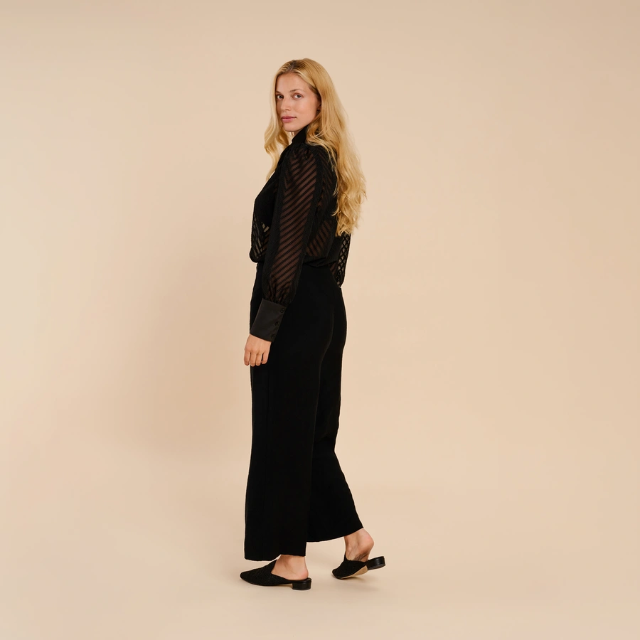 Ein Traum in schwarz ist die transparente Bluse «Soukaina». Stilvolle Details wie das grafische Muster, leichte Puffärmel und die abnehmbare Schlaufe machen die Bluse zu einem eleganten Lieblingsteil, das Sie je nach Anlass chic oder casual stylen können. Kombinieren Sie die Bluse zum Beispiel zu einer schwarzen Hose oder zu einem Bleistiftrock für einen festlichen Look.