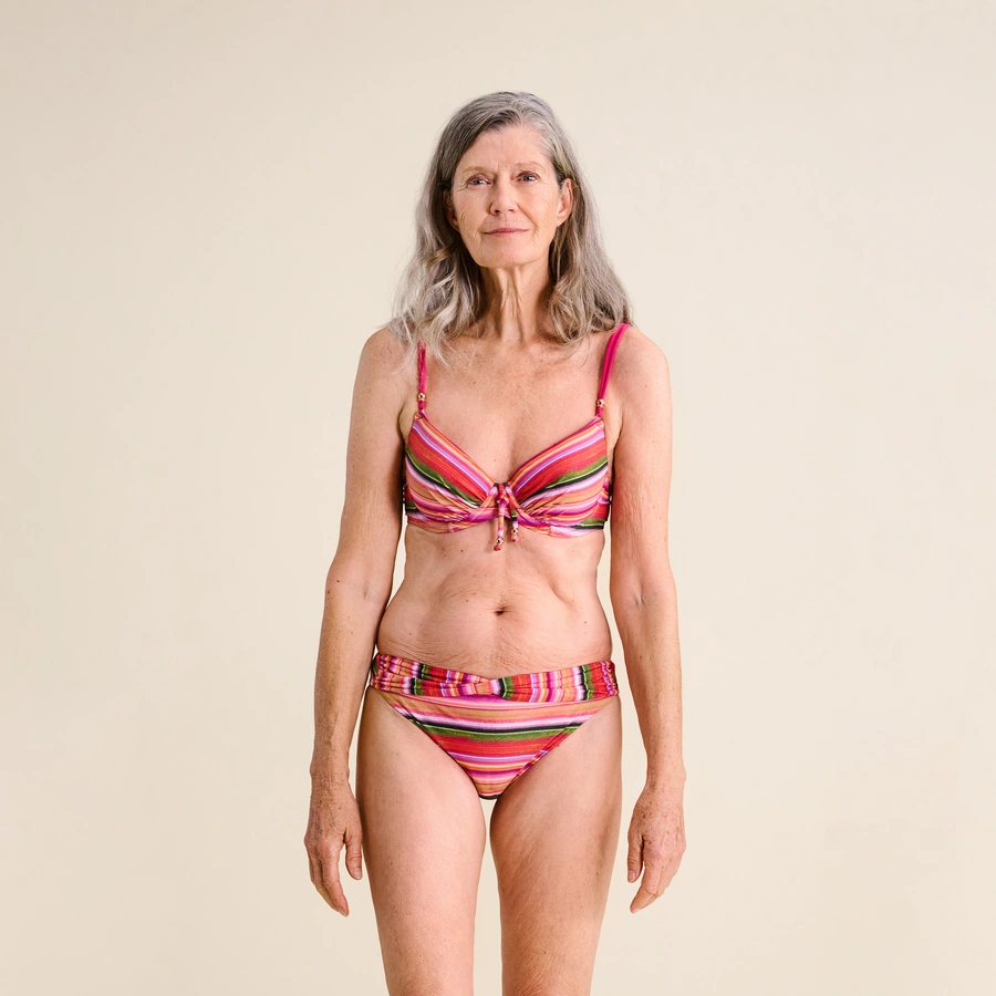 Wir lieben Streifen! Auf diesem wunderschönen Bikinislip verlaufen sie auf einem besonders weichen und anschmiegsamen Material. Vorne ist der Slip schmeichelhaft gerafft.