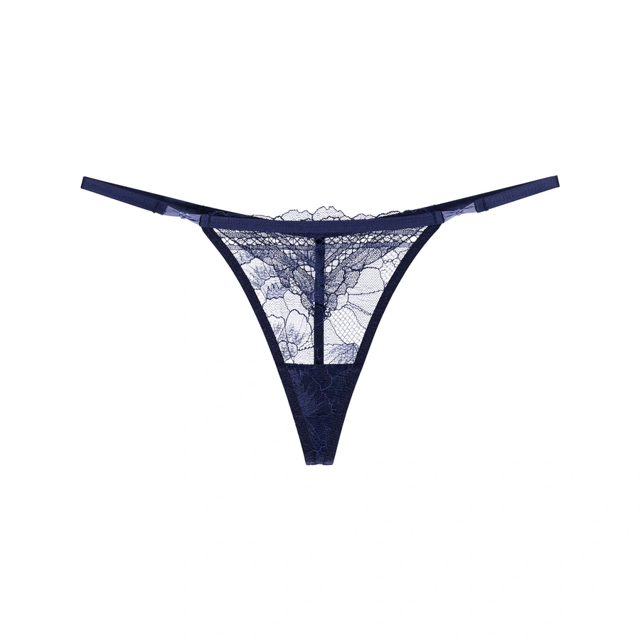 Der verführerische dunkelblaue String betört durch wunderschöne feine Allover-Spitze. Die edlen Bändchen- und Schleifendetails setzen elegante Akzente.