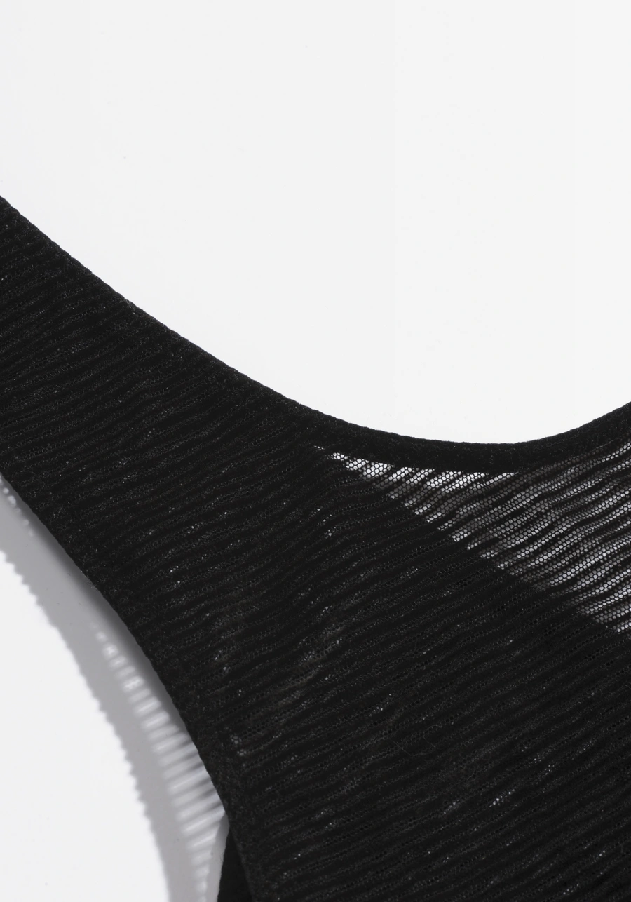 Dieser Tank-Top-Body besteht aus einem Oberteil aus italienischem beflocktem Tüll und einem Unterteil aus bequemem Stretch-Lyocell. Es ist mit einem abnehmbaren Bolero aus beflocktem Tüll geschmückt, der am unteren Ende der Ärmel mit Samtdetails verziert ist.