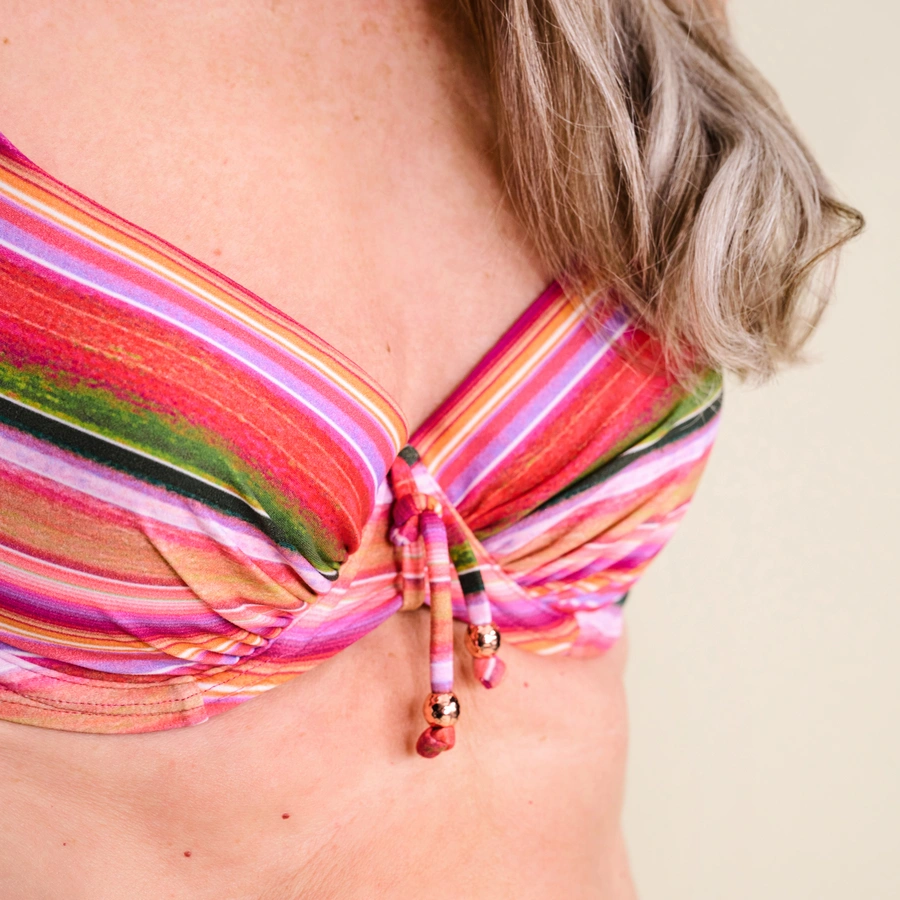 Summertime: avec son imprimé rayé coloré, ce haut de bikini met immédiatement de bonne humeur, tout comme sa matière ultra-douce et souple. Avec ses coques et ses armatures, il épouse délicatement le décolleté et s’ajuste parfaitement grâce aux bretelles multipositions unies. Le petit accessoire décoratif à l’avant attire aussi tous les regards.