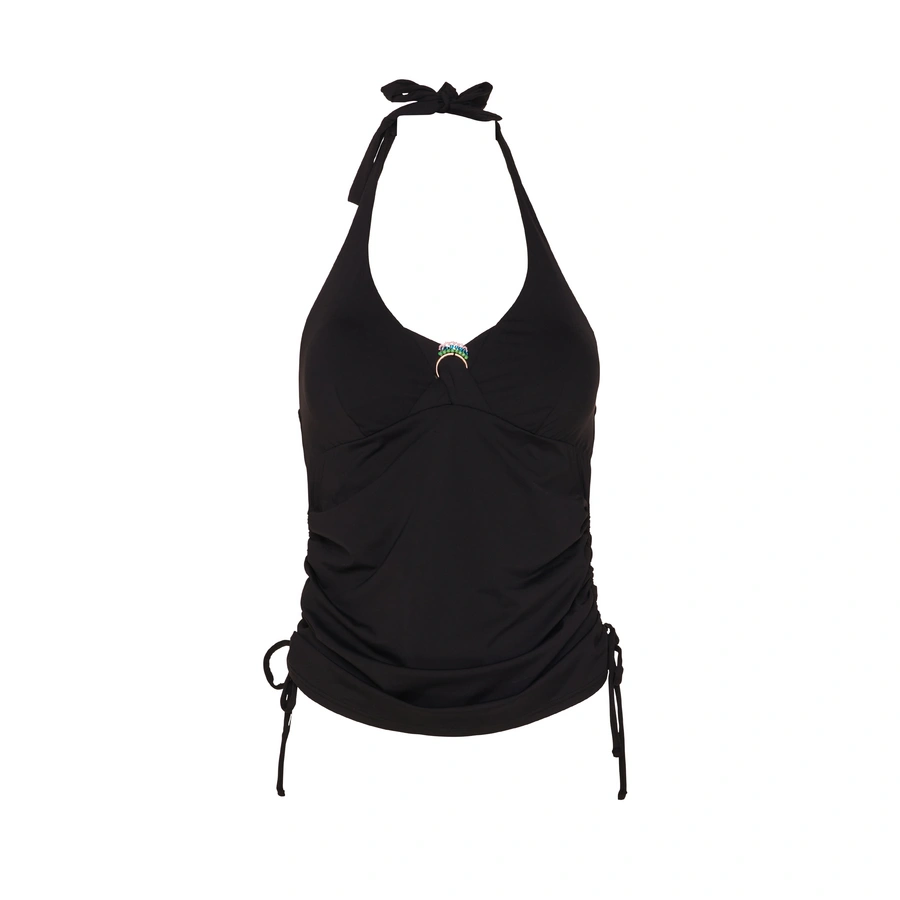 Profitez de l’été avec le tankini à nouer autour du cou MASY en noir élégant. Vous pouvez le combiner à d’autres pièces de notre collection actuelle selon vos envies. Le tankini sans armatures avec coussinets amovibles est composé de matière recyclée (B.AWARE) très agréable à porter. Son look est complété par une belle garniture. La gamme B.UNIQUE propose des pièces à la coupe parfaitement ajustée: ce très beau modèle a été conçu par des femmes pour les femmes. Pour que chaque femme trouve la coupe qui lui correspond le mieux.