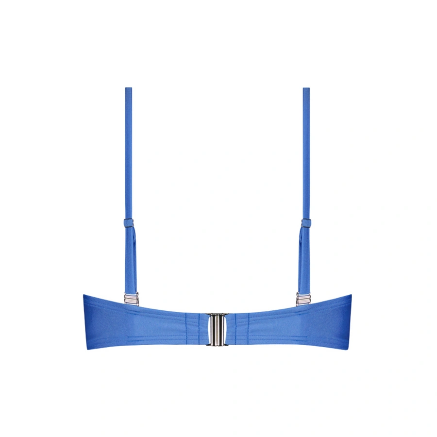 CYELL Top bikini femme avec bonnets moulés et armatures. Basé sur le célèbre haut de bikini Badeau 117, mais cette fois-ci avec une sorte d'écharpe plissée le long du décolleté du bonnet, ce qui lui donne un look particulièrement joli et élégant. Grâce au système pratique de clipsage des bretelles, le haut de bikini peut être porté de différentes manières : comme dos-nu, avec bretelles ou sans bretelles.