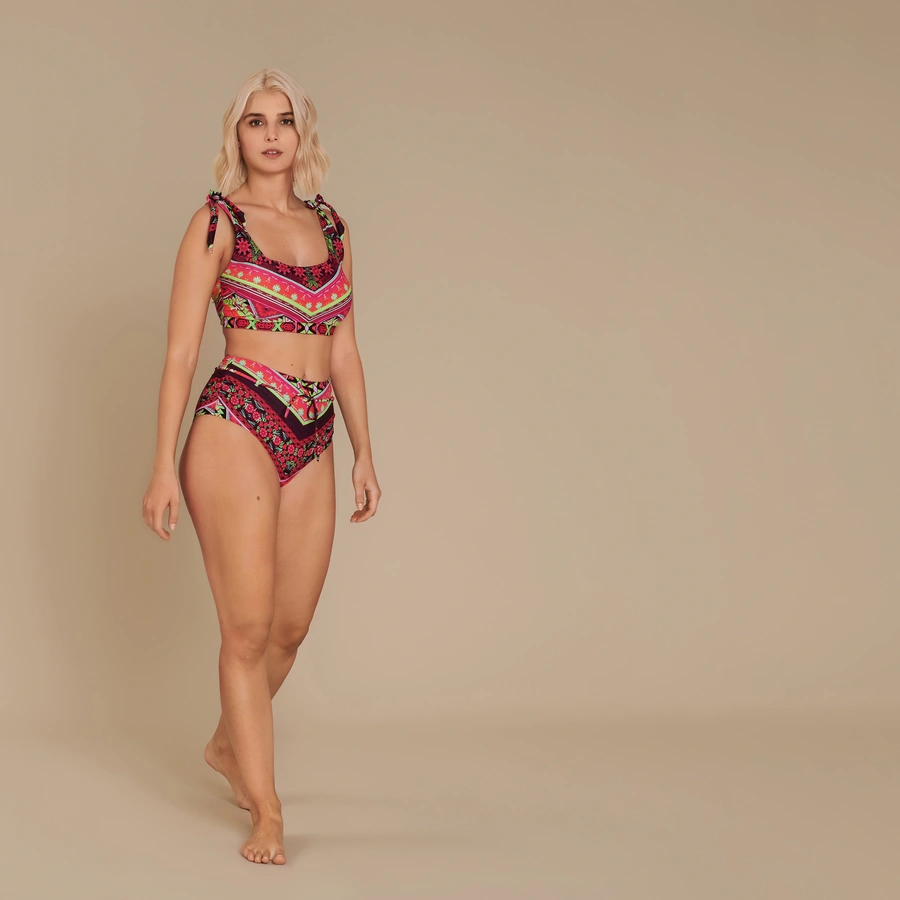 Valorizza la figura: lo slip bikini MALISCHENKA a vita alta ha una vestibilità perfetta ed è molto piacevole da indossare grazie all’elegante materiale riciclato (B.AWARE). L’intensa combinazione cromatica in fucsia con stampa etnica trasmette la forza e la sicurezza delle donne. La cintura sottile è rimovibile.