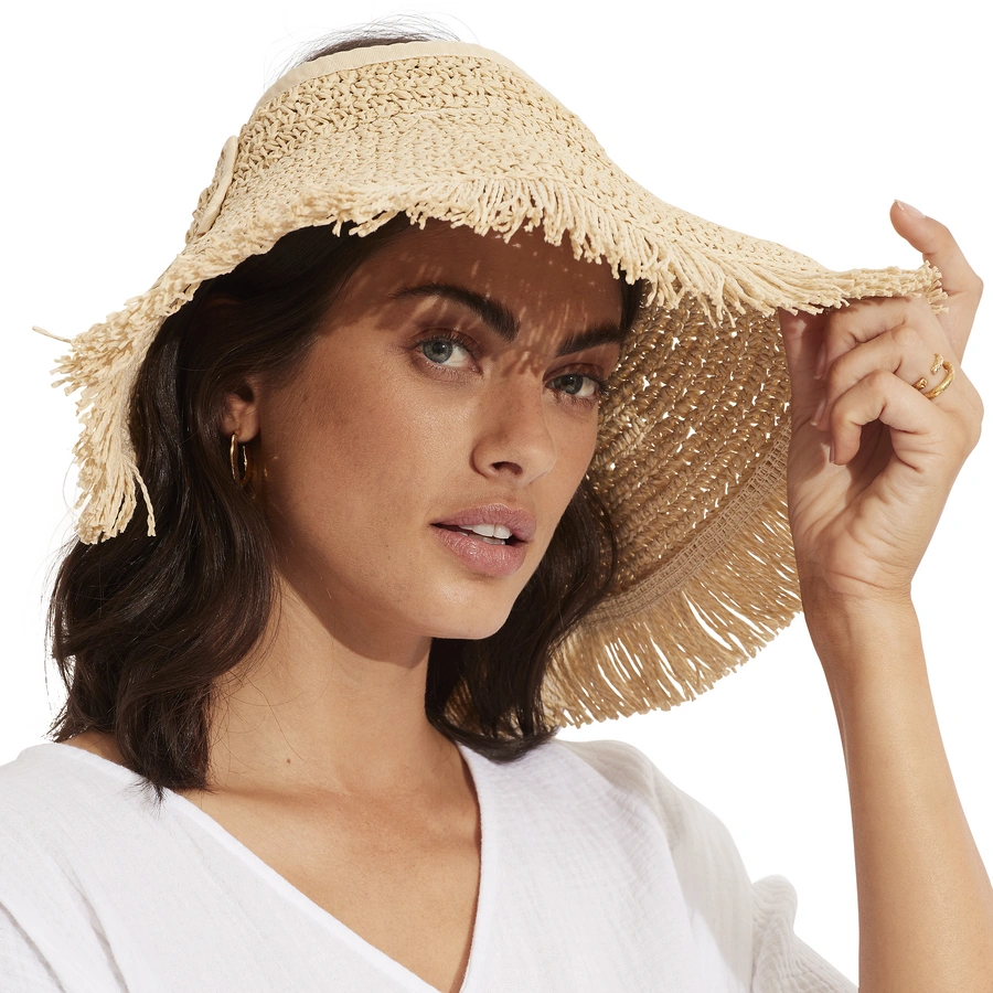 Des accessoires décontractés conçus pour le quotidien. Nos accessoires sont conçus pour vous offrir une collection de base d'options prêtes pour la plage qui peuvent être associées aux maillots de bain et vêtements de plage Seafolly. Le chapeau Roll Up Fringe Visor est un incontournable pour une protection solaire supplémentaire et un style combiné. Fabriquée à partir de 100 % papier, cette visière de plage de style rustique avec des bords à franges est idéale pour un look estival élégant. Principales caractéristiques: Détail du logo de la garniture en métal Bord large S'enroule pour le voyage Largeur du bord : 10 cm